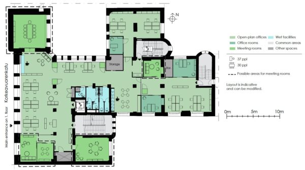 | Office space | 3 | 1342 m2 | Free | Multifunctional office space, possibility to combine Kasarmikatu 36, 5th floor 831m² space and Korkeavuorenkatu 35, 3rd floor 511m² space into one 1,342m² space. |
