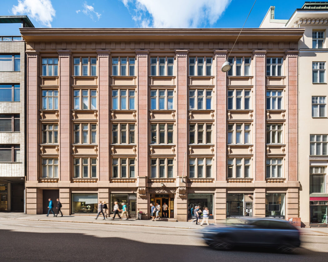 Kauppatori ja Esplanadin puisto ovat nurkan takana. Näyttävä julkisivu ja porraskäytävä toivottavat vieraat tervetulleiksi.